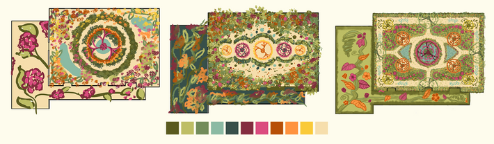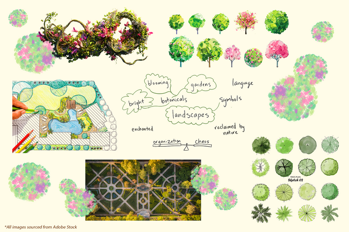Traditional French gardens seek to exert full control over shaping nature to the landscape designer's whim. While this is technically a beautiful feat, I wondered what it would be like to plan a colorful, blooming, and billowing garden within this rigid structure. Organized Chaos seeks to display the perfect marriage between the precise geometric garden plans indicative of Royal French architecture and the organic, bright and wild landscapes of Monet's Garden, which he built at his home in Giverny. This carpet design for a ballroom and pre-function area acts as a top-down view of a garden plan, featuring geometric carved planting areas, hand-painted symbols representing various flora, and stylized floral cartouche ornamentation commonly seen on interior rugs.